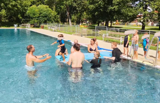 kindgerechten Angeboten wie z.B. dem Singen von Liedern, Spritz- oder Ballspielen oder dem Rutschen und Tauchen, aber vor allem mit ganz viel Spaß.